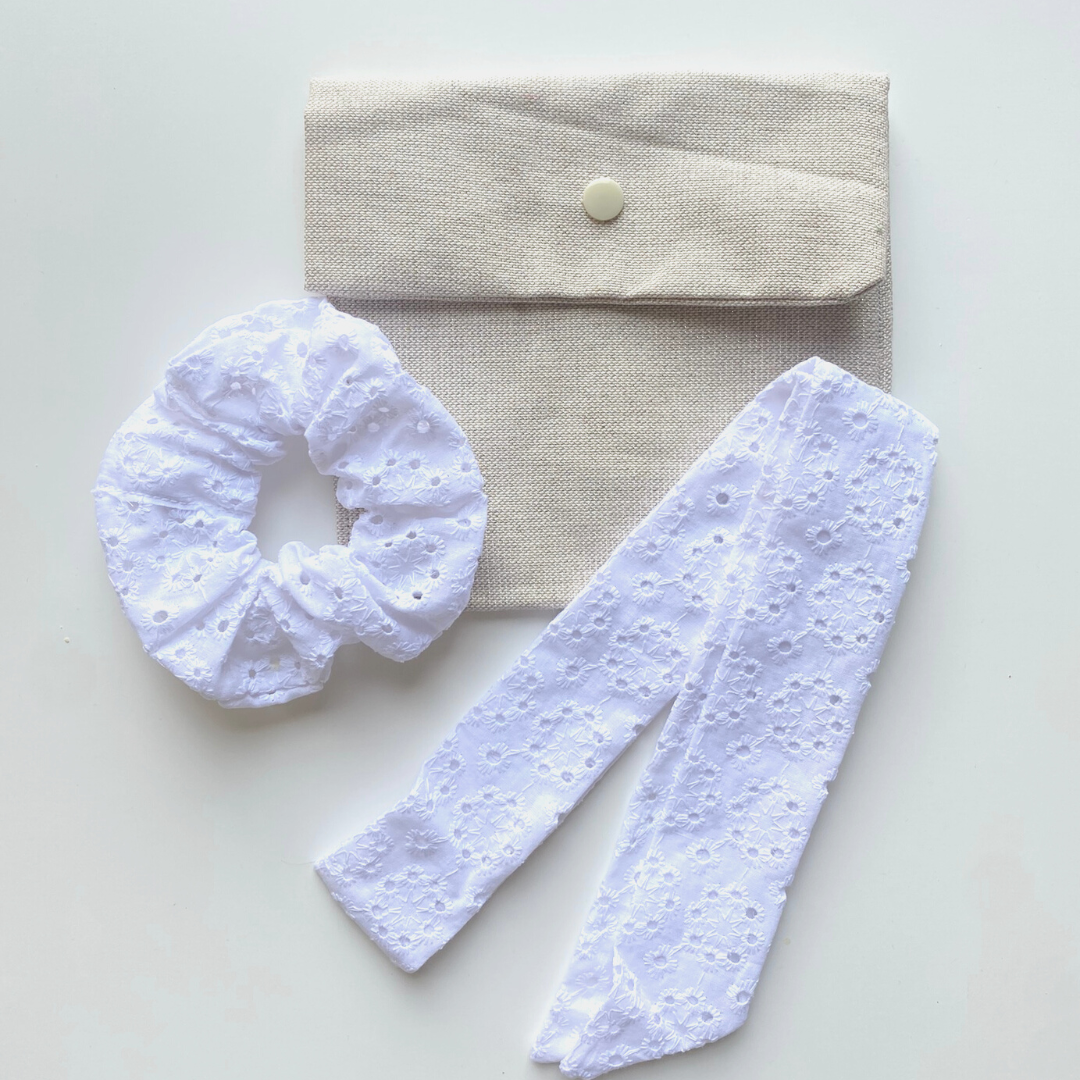 Il est composé d'1 chouchou, 1 bandeau et 1 pochette pour vos produits.