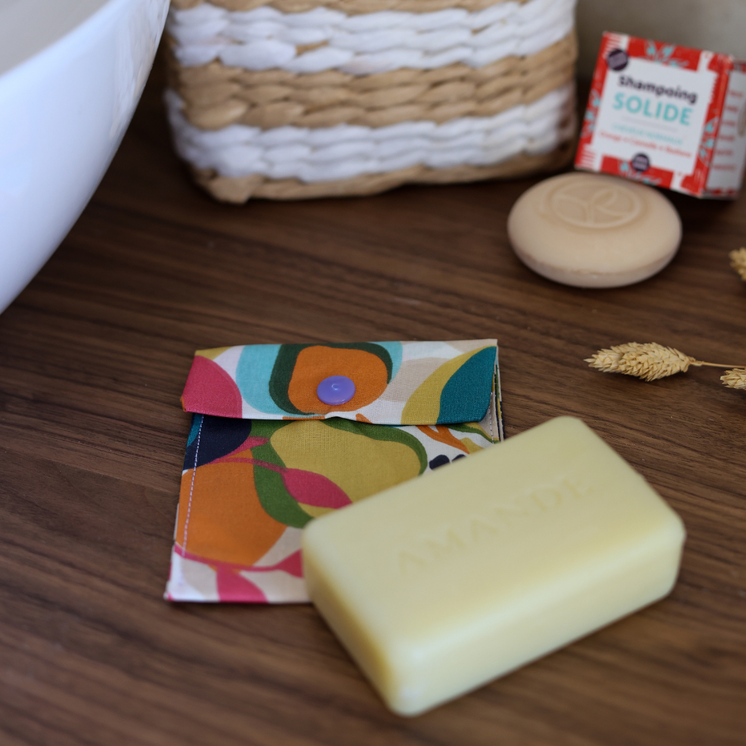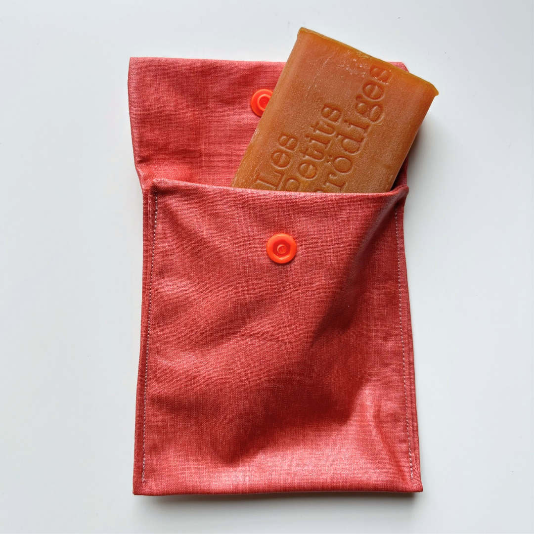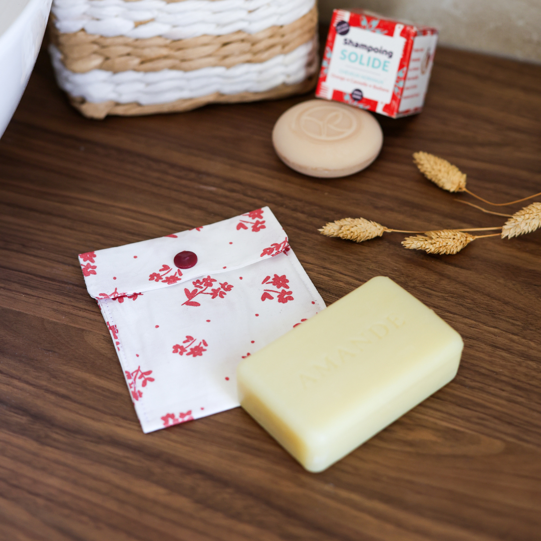 Composition : La pochette est confectionnée à partir de chutes de tissu imperméable (enduit) pour apporter votre savon partout, sans mouiller et savonner tout le reste de votre trousse de toilette.