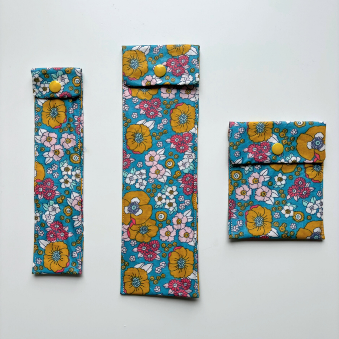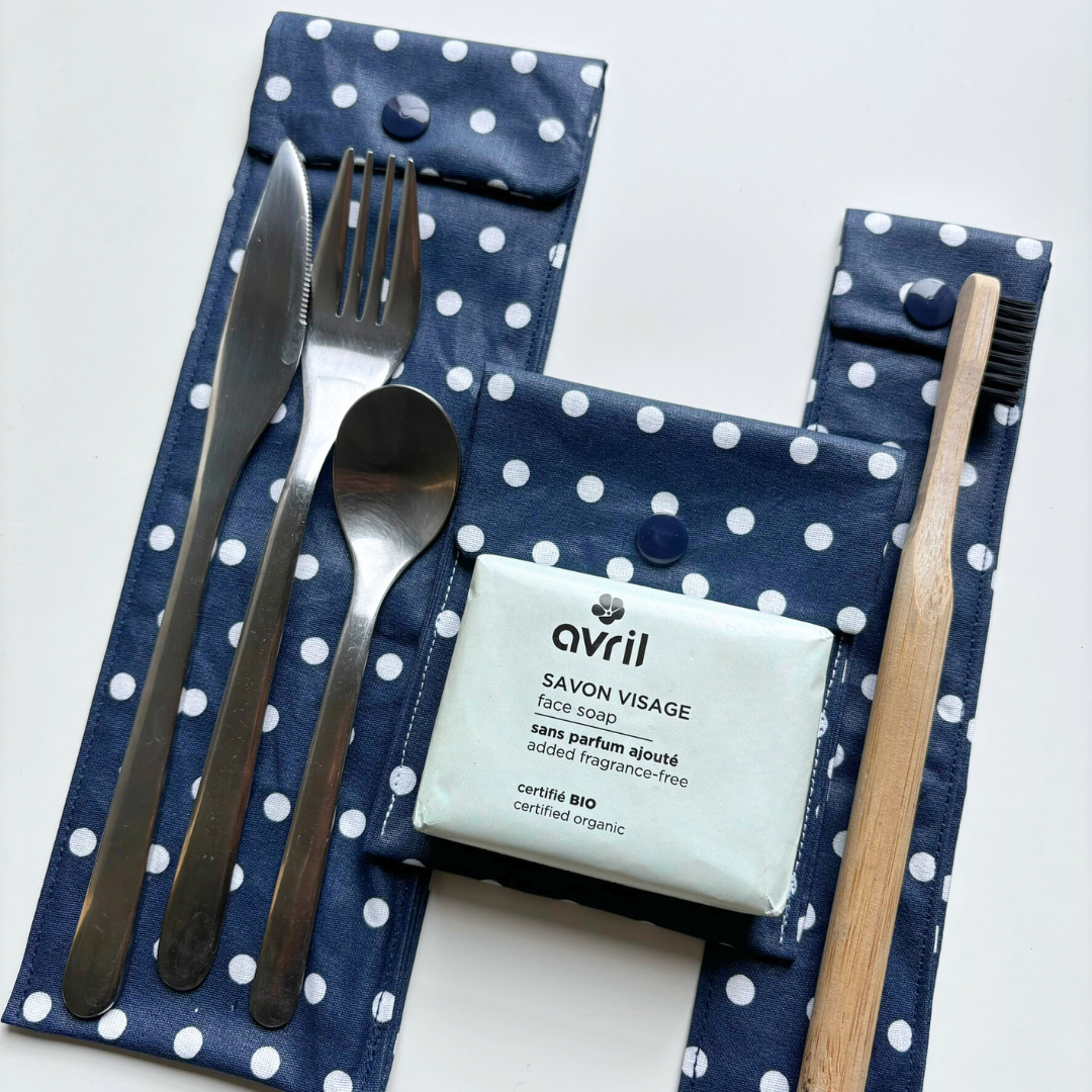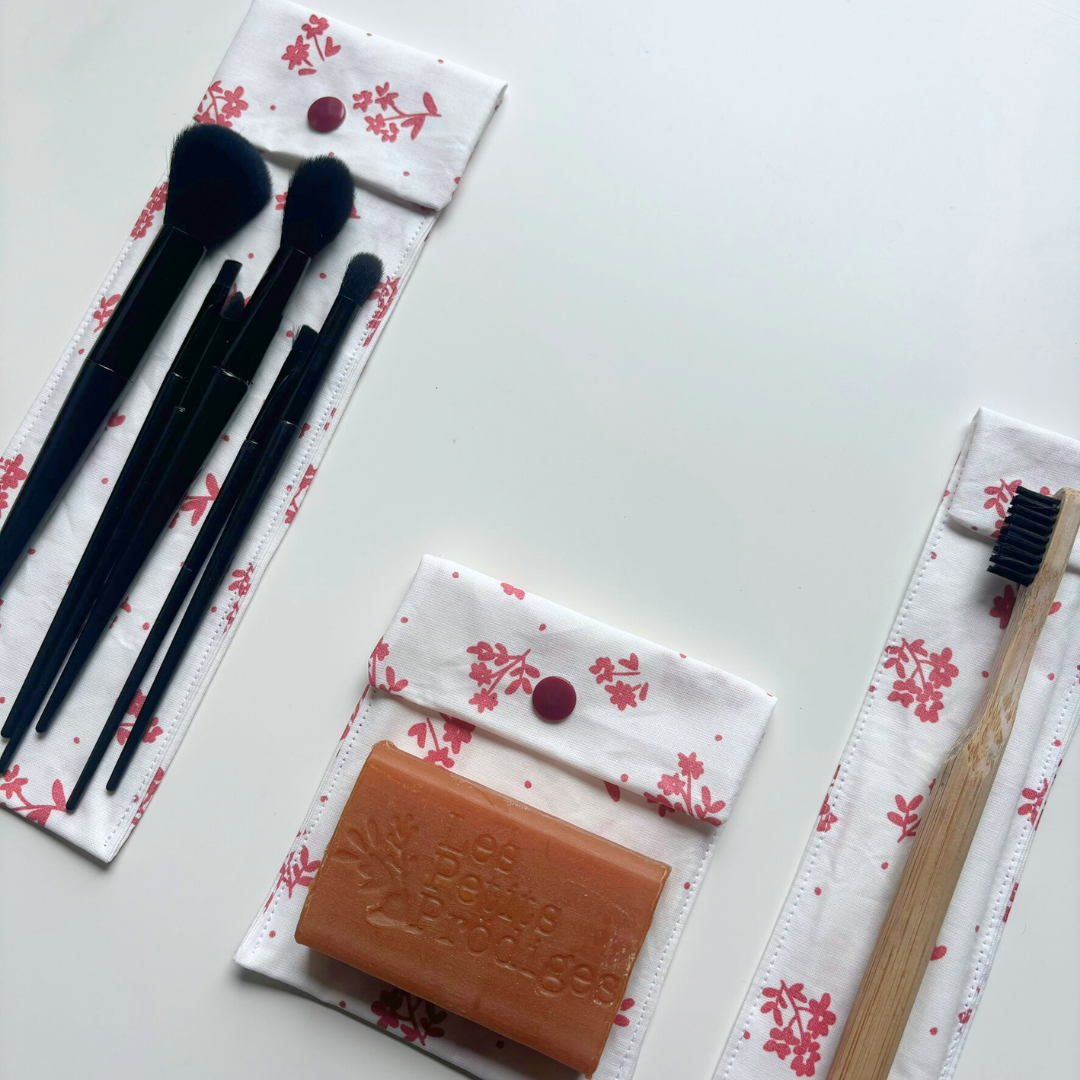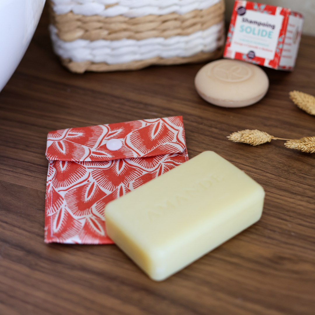 Composition : La pochette est confectionnée à partir de chutes de tissu imperméable (enduit) pour apporter votre savon partout, sans mouiller et savonner tout le reste de votre trousse de toilette.